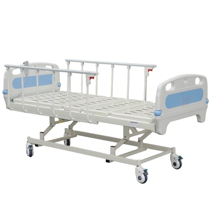 Het elektrische ziekenhuisbed is voorzien van opvouwbare aluminiumgbrails, een verwijderbaar aluminium-hout hoofdeinde, een epoxy-gecoat bedframe en een verwijderbare HDPE-stripper op het matrasplatform.